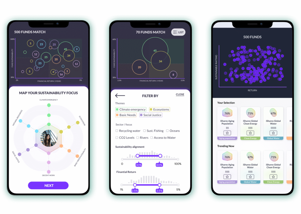 I led the end-to-end UX and product design for a green investment app to help people find ESG (Environmental, Social, and Governance) investment funds aligned with their sustainability values and their financial risk profile.
