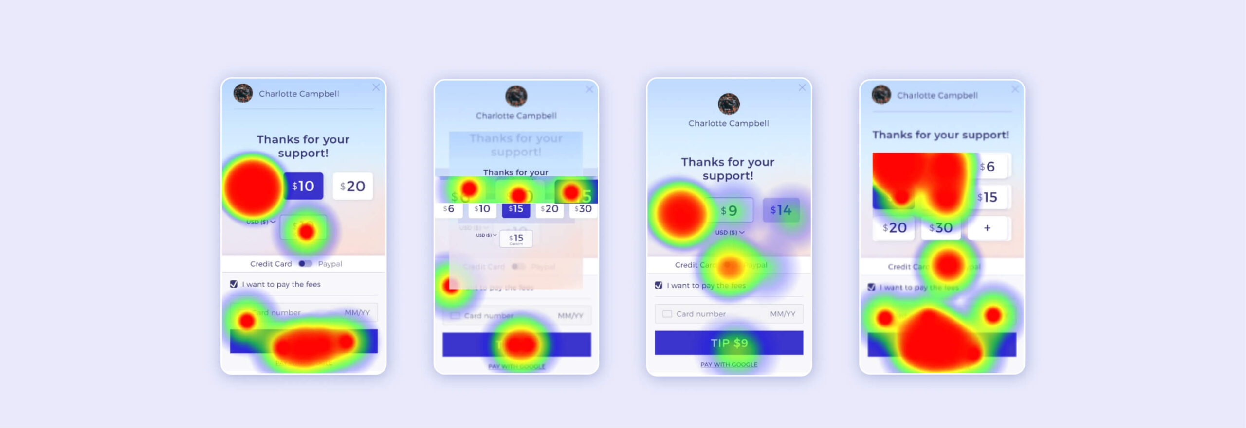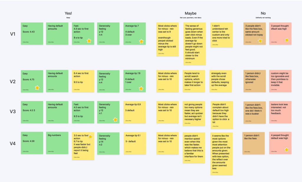 I conducted a remote test in Maze, that included 300 users, giving them one randomly-selected option to experience. I measured the time it took to complete the tip, and the value of the tips, and collected qualitative feedback to understand their feeling right after tipping.