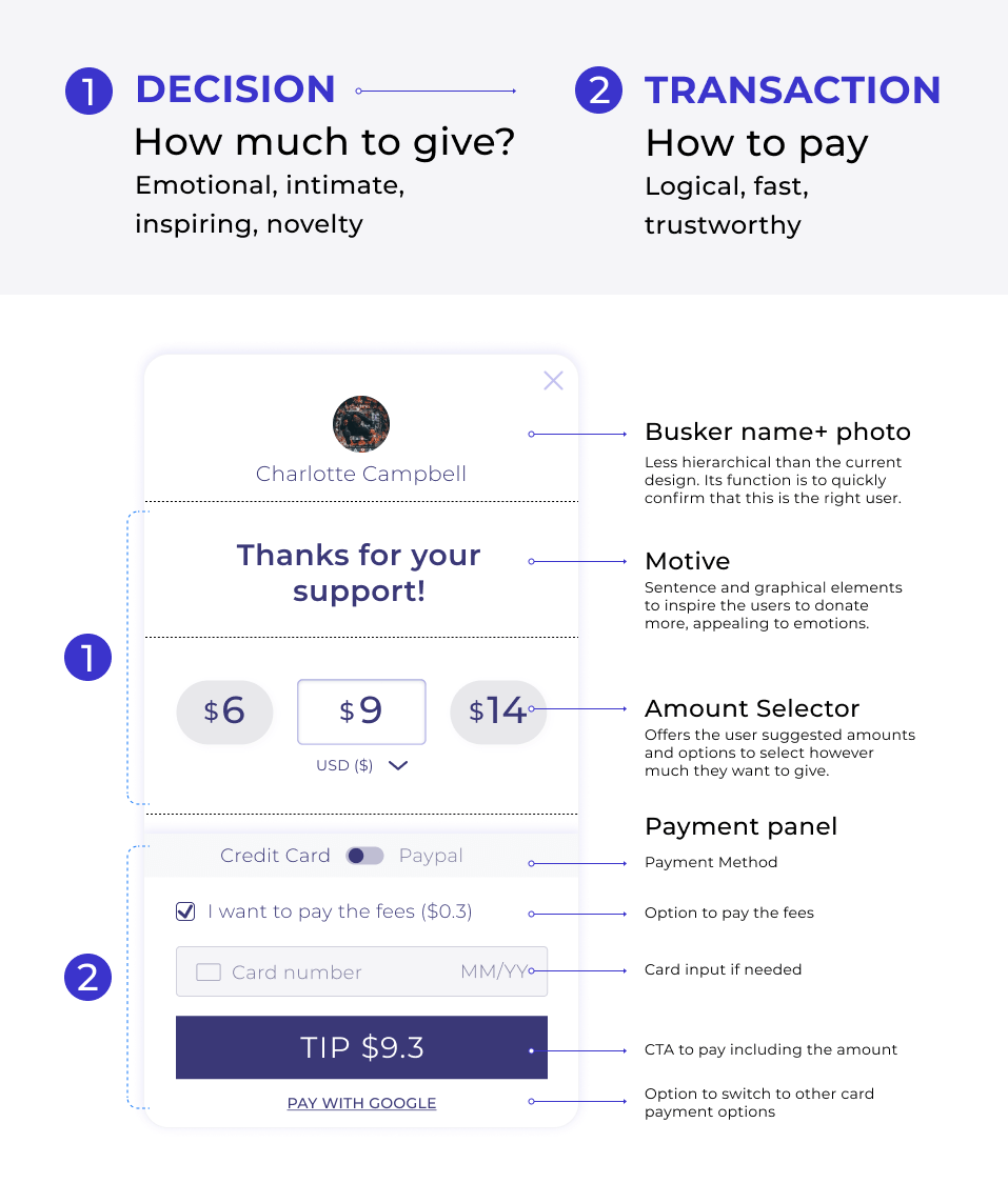 Tippers don’t have to decide how much to give and how to pay, all at the same time. Instead, they first focus on the emotional aspect of giving, reinforcing their already existing motivation to tip, and afterwards, they analyse the transaction options and complete the tip efficiently.